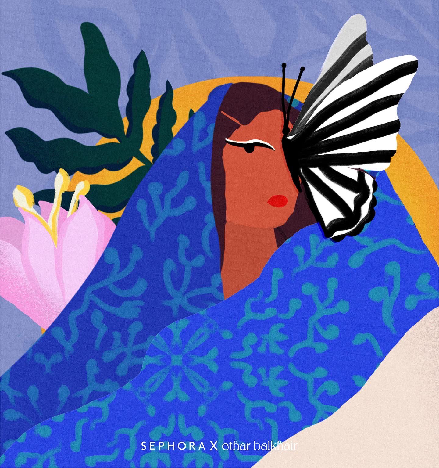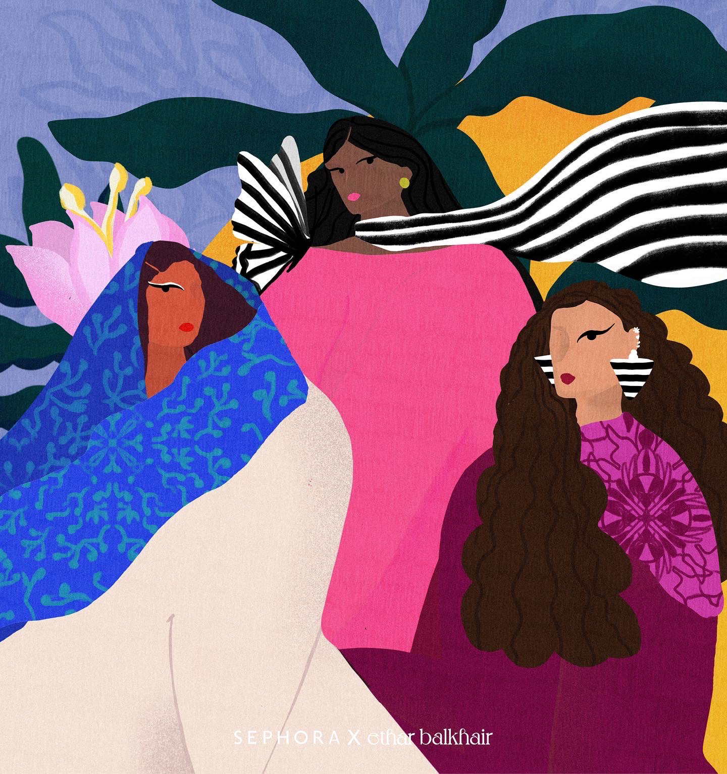 I illustrate diverse females from our region celebrating themselves. Including organic natural elements within Sephora’s iconic strips reflected throughout the illustration.